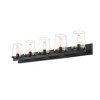 Conquer lighting challenges in a large bath space with the enticing Callista five-light vanity light and its mix of nautical vibes with village charm. Fashioned with a frame featuring clean lines and construction of hand-crafted matte black finish steel, it defines spatial elements and adds a dramatic aesthetic. Delicate-looking clear tapered glass shades align to filter ambient lighting as well as provide a sophisticated glam look. Dimmable: Yes Shade Included: Yes