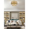 Bring glittering ambiance with the wide tiers of sparkling crystals featured in this modern glam 12-light flush mount ceiling light from the Dealey collection. Designed to make a statement, the piece features two cut-out steel drums in heirloom brass finish, dotted with faceted crystals that gleam and glitter in the light. This gracious fixture delivers the ambiance of a grand chandelier in a fraction of the space, perfect for hard-to-fit spaces.
