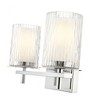 Timeless beauty follows the layered multi-part design of a glass and steel two-light vanity light, a perfect solution for conquering lighting challenges in a contemporary space. Intricate detail is textural and artisan with clear glasswork in a cylinder shape, with an inner white diffuser. Etched opal and clear glass blend as they enhance chic brushed nickel finish framing and show off a crisp mix of circles and lines.
