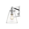 Contemporary bathrooms light up with the chic, delicate design of this one-light wall sconce. With a conical shade crafted of clear glass, it adds a charming motif with a brushed nickel finish hand-tooled steel mount adding festive geometric accents. This light from the Harper collection dazzles in a custom bath space. Dimmable: Yes Shade Included: Yes