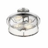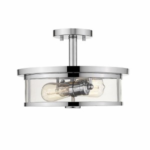 Highlight a mid-century modern style with this contemporary two-light semi flush mount. A luminous chrome finish underscores the clear glass small cylinder shade. Bathroom/Bedroom/Dining Room/Dinette/Foyer/Game Room/Hallway/Kids Room/Kithcen/Kitchenette/Living Room/Office/Utility Room Shade Included: Yes Dimmable: Yes Material: Steel, Finish Color: Brushed Nickel, Width: 13.75", Height: 9.75", Lamping Type: Incandescent, Number Of Bulbs: 2, Wattage: 100 Watts, Dimmable: Yes, Moisture Rating: Dry Rated