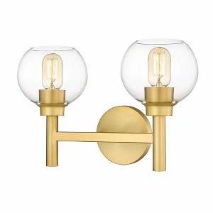 A contemporary two-light vanity sconce boasts graceful curves that create its perfect circle design elements. Its familiar, torch-inspired silhouette is adorned with a brushed gold finish for warm, glamorous flair in an entry or bathroom. A pair of open-edged, clear glass globe shades adds precision, and this fixture can be mounted with lights either up or down to best suit your space and preference.
