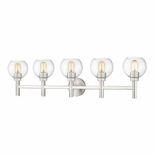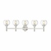 Span a graceful double vanity space with the exacting precision of a modern five-light vanity wall light. Designed inspirations come from the perfect form of a circle, comprised of open-edged globe shades in clear glass. Torch-style framework and a round wall plate are crafted in steel and receive a warm olde brass finish for timeless elegance.