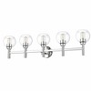 Span a graceful double vanity space with the exacting precision of a modern five-light vanity wall light. Designed inspirations come from the perfect form of a circle, comprised of open-edged globe shades in clear glass. Torch-style framework and a round wall plate are crafted in steel and receive a warm olde brass finish for timeless elegance.