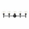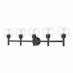 Span a graceful double vanity space with the exacting precision of a modern five-light vanity wall light. Designed inspirations come from the perfect form of a circle, comprised of open-edged globe shades in clear glass. Torch-style framework and a round wall plate are crafted in steel and receive a warm olde brass finish for timeless elegance.