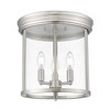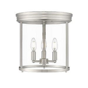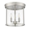 Create a rich, welcoming ambiance in your foyer or living area with a modern three-light flush mount ceiling light. Designed for the Thayer collection, it's a timeless presentation that features a sleek cylinder of glass tucked into a brushed nickel finish framework that offers refined, inviting energy in any setting. Material: Steel, Finish Color: Brushed Nickel, Width: 13", Height: 13", Length: 13", Lamping Type: Incandescent, Number Of Bulbs: 3, Wattage: 60 Watts, Dimmable: Yes, Moisture Rating: Damp Rated