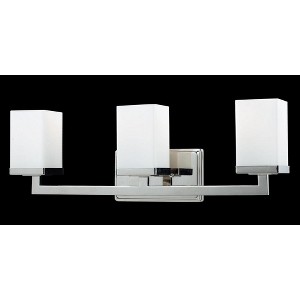 This three light vanity fixture provides a clean modern look with its use of rectangular matte opal shades and chrome geometric inspired hardware. This fixture can either be hung up or down, depending on the needs of the user. Material: Glass, Finish Color: Chrome, Width: 23.25", Height: 8", Length: 5", Depth: 5", Backplate Width: 4.5", Backplate Length: 8", Lamping Type: Incandescent, Number Of Bulbs: 3, Wattage: 100 Watts, Dimmable: Yes, Moisture Rating: Damp Rated