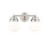 A perfect choice flanking a vanity or in a dressing area, this modern two-light wall sconce showcases Mid-Century Modern character. Schoolhouse-style glass overflows with personality, offering both vintage aesthetics and lovely, diffused illumination. The fixture is defined with a bright brushed nickel finish that complements in virtually any home. Material: Steel, Finish Color: Brushed Nickel, Width: 7.75", Height: 9.5", Depth: 15.5", Backplate Width: 4.7", Backplate Length: 4.7", Lamping Type: Incandescent, Number Of Bulbs: 2, Wattage: 60 Watts, Dimmable: Yes, Moisture Rating: Damp Rated