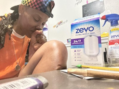 I make my own bug trap using an led bulb that emits UV surrounded by a roach trap stapled into a tube. I sit vinegar/water/sugar traps next to it as well as a physical trap made from a 1 liter bottle with the top cut and inverted and taped. Attractive food is simply dropped into the bottle. I am near two houses that have chicken coups and too many outdoor collectors of water that harbors the growth of "no seeums". My methods are very effective for attracting them. I get major whelps from bites and my next job is to spray my yard and the trees that surround my backyard fence! Initial cost for zevo well exceeds my uv bulb cost and using Roach traps is very cheap compared to zevo refills. Photo attachment: 4009.jpg