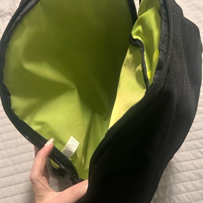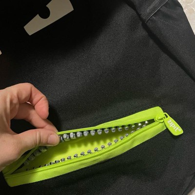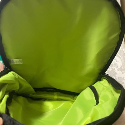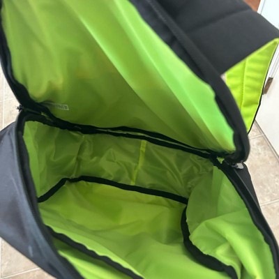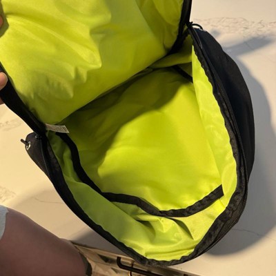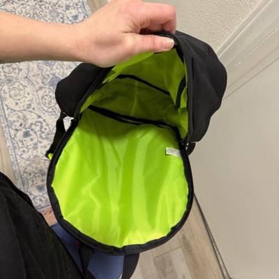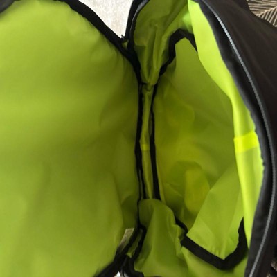 This backpack has a decent amount of space in it. It is black with fluorescent lime green trim, which is probably a good safety feature. It really only has one zipper opening. It has two side elastic bottle holders and then it has a front pocket which opens on a big chunky zipper that’s meant to look like the teeth . The straps are padded and comfortable and it’s a really fun bag.