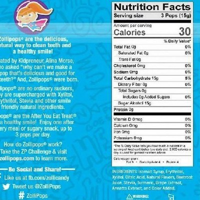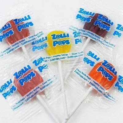 Zollipops, The Clean Teeth Pops are no ordinary suckers, they are supercharged with smile friendly ingredients. Each Zollipops contains erythritol and xylitol, two favorites with dentists! Zollipops naturally help reduce the acidity and raise the ph in your mouth. High acidity contributes to tooth decay and by reducing acidity we can help teeth re-mineralize faster making them stronger and harder. Zollipops were created by Alina Morse, an innovative young girl in Michigan who decided she wanted to create a sugar free candy that tastes great AND is good for your teeth. Alina set off to find and incorporate the best possible ingredients with delicious flavors. You'll love the taste and the smooth, clean feeling Zollipops deliver. Zollipops are made with an amazing new formula that does not melt or get sticky. We offer longer lasting flavors and an extended shelf life. Zollipops are the perfect after you eat treat for a healthy smile! Store them in your purse or backpack and enjoy one after every meal.