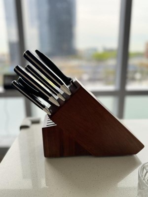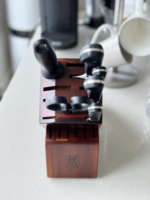 The Zwilling Pro 7pc Knife Block Set in Walnut is a perfect base build set. The included knives are the essentials to which you can add additional tools of your choice. Zwilling cutlery products are known for their thoughtful engineering, quality build, and attention to detail; it's obvious that every hand on the factory floor takes pride in the product. The knives are flawless and very sharp. The Pro series knives are robust, well balanced, and very comfortable especially if utilizing a pinch grip making knife work a joy. The knife block is a gorgeous deep walnut color with contoured slots to accommodate the blended bolster of the Pro series knives.