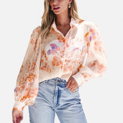Amaryllis Women's Sheer Floral Button-Up Blouse Lightweight Long Balloon Sleeves Elegant Workwear Top