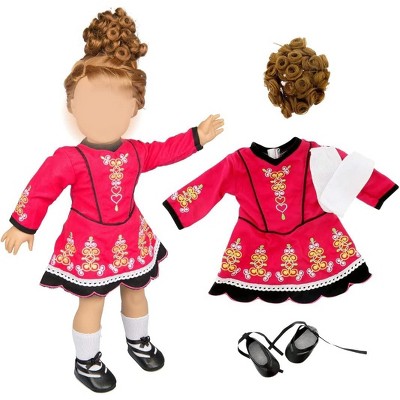 Irish Step Dancing Doll Outfit (4 Piece Set) Clothes and Accessories for All 18" Dolls - Includes Dance Dress, Brunette Hairpiece, Gillies & Leggings