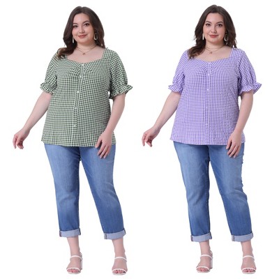 Women's Plus Size Gingham 1950s Plaid Sweetheart Neck Button Decor Short Sleeve Two Piece Blouses - Agnes Orinda