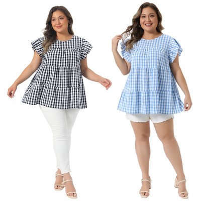 Women's Plus Size 1950s Gingham Crew Neck Flare Short Sleeves Summer Babydoll Two Piece Blouse - Agnes Orinda