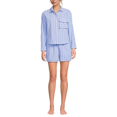 Lands' End Women's Cotton Poplin 2 Piece Pajama Set - Long Sleeve Top and Shorts with Piping