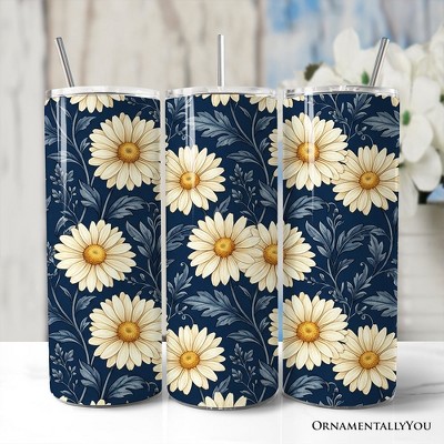 Vintage Daisy Floral Pattern 20oz Tumbler With Lid and Stainless Steel Straw, Navy Blue Cottage Garden Gift Cup | OrnamentallyYou