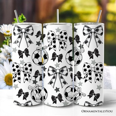 Coquette Black and White Soccer Bow 20oz Tumbler With Lid and Stainless Steel Straw, Sporty Girls Pattern Gift Cup | OrnamentallyYou