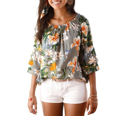 Women's Off Shoulder Ruffle Blouse, 3/4 Puff Sleeve Tie-Front Top, Casual Boho Shirt