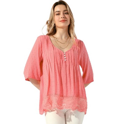 Allegra K Women's Lace Trim Ruched Comfy Summer 1/2 Sleeve V Neck Shirt