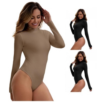INSPIRE CHIC Women's High Neck Long Sleeve Tops Slim Fit Bodysuit Jumpsuit 3 Packs