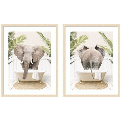 Kate and Laurel Elephant Palm Bathtub 2 Piece Framed Wall Art Print Set by Amy Peterson, Woodgrain Stripe Blonde, 2 Piece Set 26x33