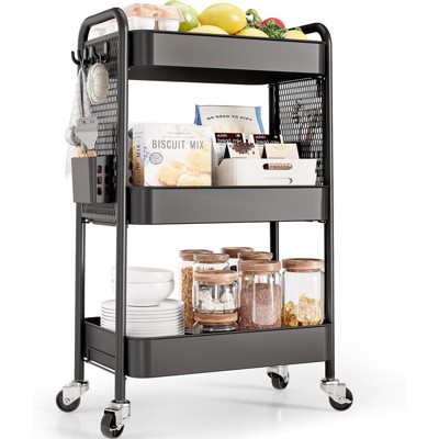 Aoibox 3 Tier Metal Rolling Cart Organizer with Wheels Hooks Bins Pegboard 17.3 x 12 x 31.1 Inch for Nursery Kitchen Office