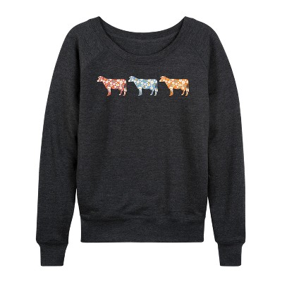 Women's - Instant Message - 3 Small Floral Print Cows Lightweight French Terry Wide Neck Long Sleeve Graphic Shirt