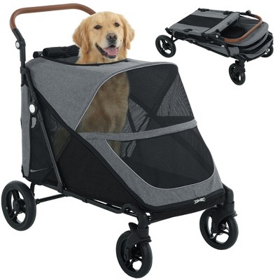 PawHut Dog Stroller for Large Dogs, One-Click Folding 4 Wheel Large Pet Stroller w/ 8-Position Adjustable Handle, All-Terrain Spring Suspension, Gray