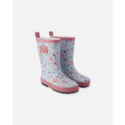 Deux par Deux Girl Rain Boots in Natural Rubber Blue Mini Flower Print