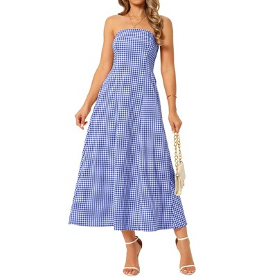 INSPIRE CHIC Women's Gingham Strapless Sleeveless Off Shoulder Smocked Beach A-Line Maxi Sundress