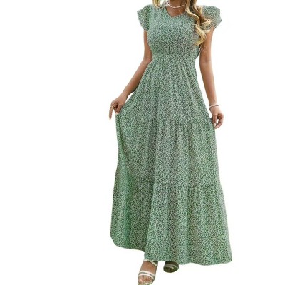 Womens Long Summer Dress Short Flutter Sleeve V Neck Casual Smocked Tiered Modest Floral Boho Maxi Dress