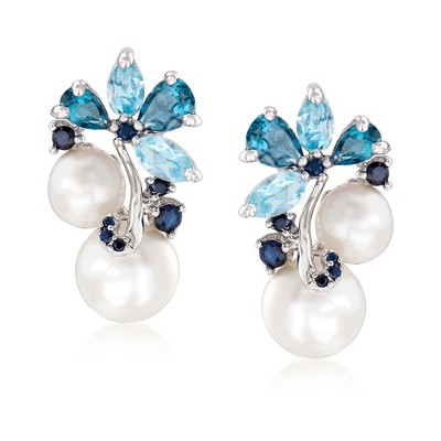 Ross-Simons 6-8.5mm Cultured Pearl and 2.00 ct. t.w. Sky Blue Topaz and London Blue Topaz Earrings With .10 ct. t.w. Sapphires in Sterling Silver