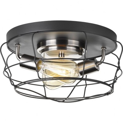 Progress Lighting, Gauge Collection, 2-Light Flush Mount, Graphite Finish, Open Cage Design, Steel Frame