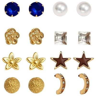 Women’s Mixed-Style Alloy Earring Set, Modern Stud & Huggie Designs (Blue Crystal/Pearl/Flower/Star), Versatile Jewelry for Daily & Special Occasions