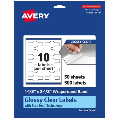 Avery Glossy Clear Wraparound Band Labels with Sure Feed, 1.5" x 3.5", 500 Glossy Clear Labels, Print-to-the-Edge, Laser/Inkjet Printable Labels