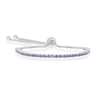 Bella Silver Sterling Silver 2MM Amethyst CZ 'February Birthstone' Tennis Adjustable Bolo Bracelet - Purple