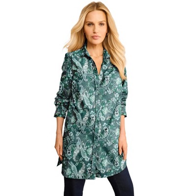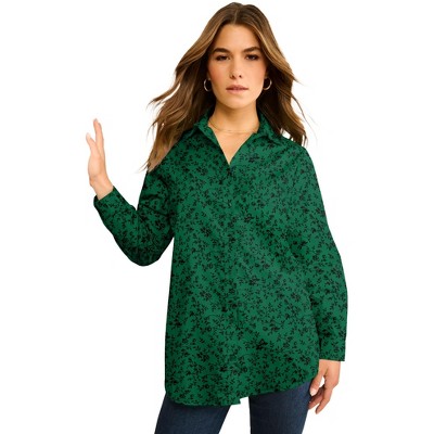 Roaman's Plus Size Juliet Lace Trim Button-Down Shirt 34 W, Emerald Black Bouquet