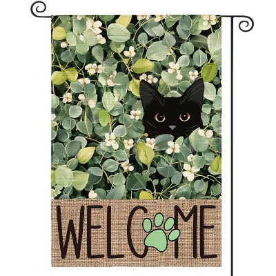 Spring Summer Floral Garden Flag 12x18 Inch 1-Sided Outside, Eucalyptus Black Cat Welcome