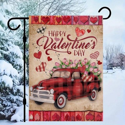 Lomsoe Happy Valentine's Day Garden Flag Vintage Red Plaid Truck Flag Anniversary Wedding Flag Valentines Gift Valentines Decor Single Side 12x18 Inch