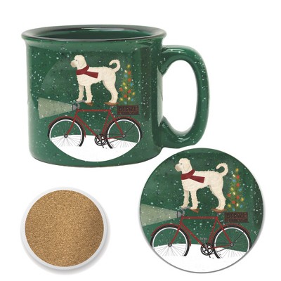 Courtside Market White Doodle on Bike Christmas 15 oz Cozy Mug & Coaster Set