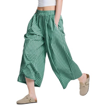Women's Plaid Gingham Skirt Pants Flowy Oversized Wide Leg Elastic Waist Palazzo Casual Trousers with Pockets