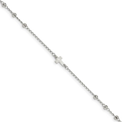 Black Bow Jewelry Rhodium-Plated Sterling Silver Cross With D/C Beads Anklet, 9-10 Inch