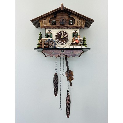 Chalet Desktop Cuckoo Clock 10 Inch With Girl On Rocking Horse, Waterwheel, 12 Melodies, Hourly Cuckoo By River City Clocks