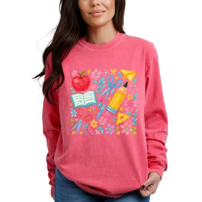 Watercolor Teacher Apple Collage - Womens Garment Dyed Long Sleeve
