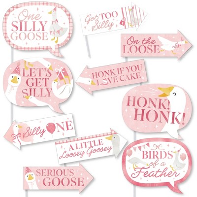 Big Dot of Happiness Funny One Silly Goose Pink Photo Booth Props Kit, Goose-Themed Puns for Girl 1st Birthday Supplies - 10 Count Selfie Prop Sticks