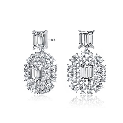 Guili Sterling Silver Rhodium Plated Clear Emerald with Round Cubic Zirconia Lace Cluster Drop Earrings, a Regal and Intricate Vintage Design