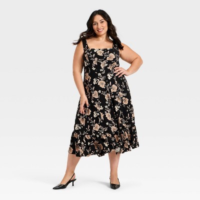 Women's Plus Flutter Cap Sleeve Tiered Maxi A-Line Dress - Ava & Viv™ Black/Tan Floral