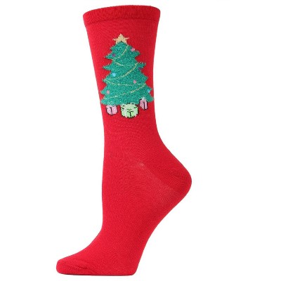 Memoi Women's Embroidered Christmas Tree Crew Socks Tango Red One Size